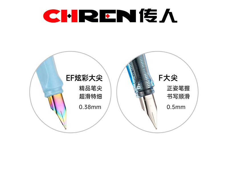 规 格:1支EF炫彩大尖换囊钢笔 + 1支F大尖换囊钢笔+3支可替墨囊(2支蓝+1支黑)。