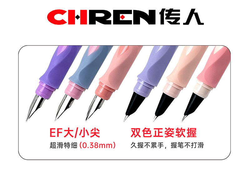 “传人初学用"热敏可擦钢笔,笔身弹性漆外观,触感细腻亲肤,渐变颜色效果清爽柔和不伤眼,是初学用钢笔不二之选。三角正姿软胶笔握,久握不累手,握笔不打滑;热敏可擦,笔尾附带橡皮头,写错就改,一擦即净。