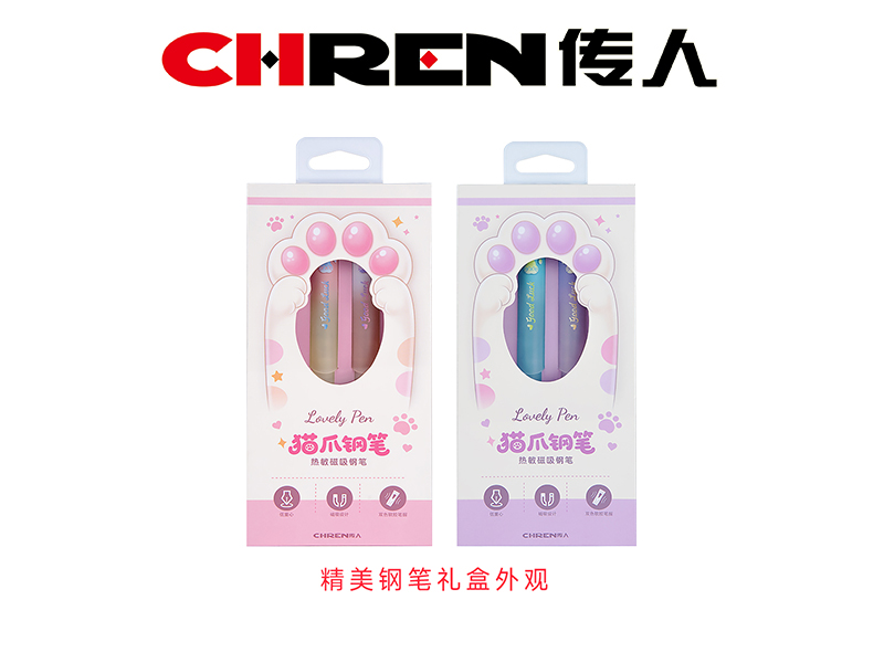产品特点:精美猫爪创意造型钢笔礼盒。笔身渐变的弹性漆,像把春日樱花揉进了手心。笔套印有精美3D打印图案,增添书写乐趣。正姿双色软握,久写不累手,握笔不打滑,有助于矫正握姿,是学生练字的好选择;笔尾附带热敏可擦橡皮头,写错就改,一擦即净。配备润笔器,润一润更好写。创新包装,适用于礼品和超市销售。